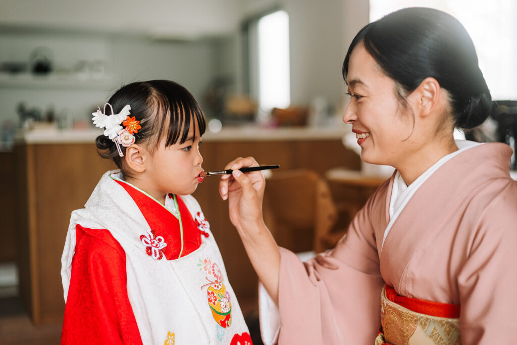 あの朝のパジャマ姿から、段々と着付けが仕上がっていく時間。 ヘアメイクさんの手が近づくたびに、娘の表情が変わっていくあの瞬間。 お母さんにリップをしてもらって、少し照れくさそうに笑った顔。