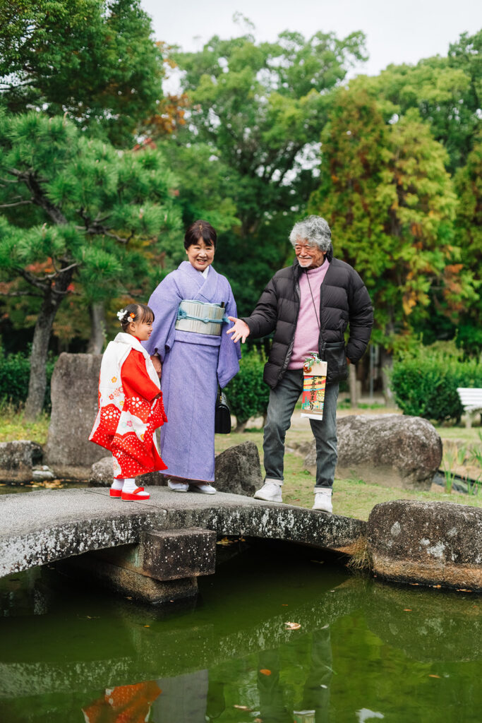 石橋の上で、じいじとばあばとHちゃんが並んだ。3人の後ろに広がる緑と、池の錦鯉。「見て見て」とHちゃんが指さすたびに、大人たちが一斉にのぞき込む。