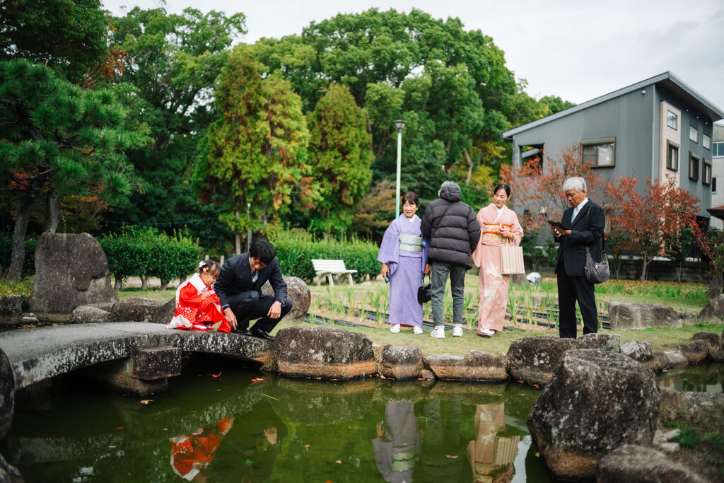 11月の週末でも混雑が激しすぎることはなく、落ち着いて撮影できる印象です。そして神社のすぐ隣には知立公園があるので、ご祈祷後に移動すれば雰囲気がガラッと変わる。池と石橋、秋の紅葉——お子さんが自由に動き回れる開放感も、この場所ならでは。コンパクトなエリアで、一日分のストーリーが完結します。