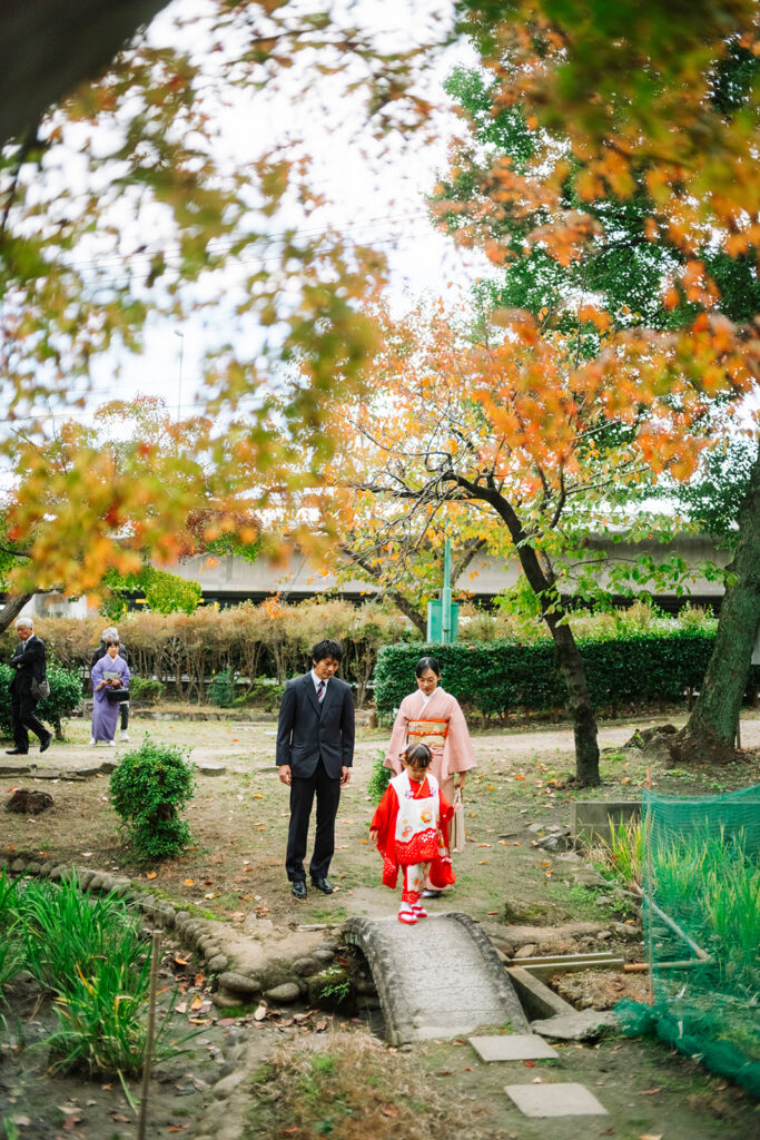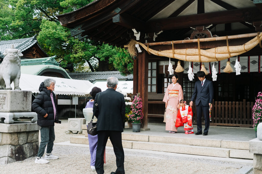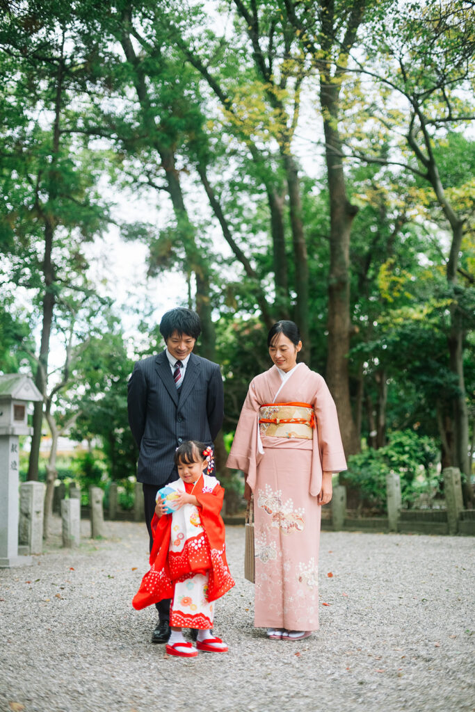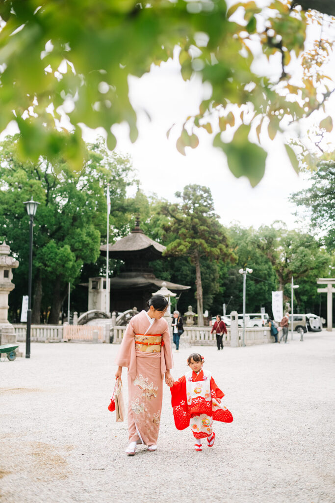 フォトグラファーとして特に感じるのは、緑の濃さ。11月でも境内の木々がしっかり茂っていて、着物の赤や淡いピンクが緑に映える。晴れた日も曇りの日も、光が柔らかくてとても撮りやすい場所です。