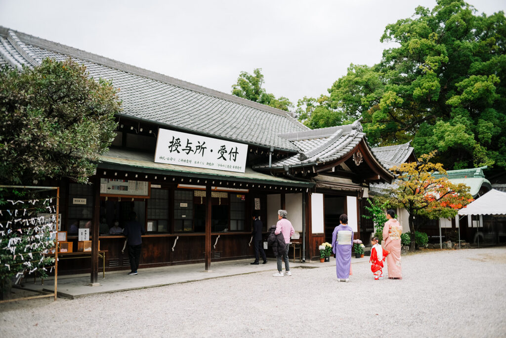 授与所で受付を済ませ、ご祈祷へ。フォトグラファーは外で待機しながら、ご家族が戻ってくる瞬間を待つ。扉が開いて、Hちゃんが出てきたとき——朝とはまた別の顔をしていた。