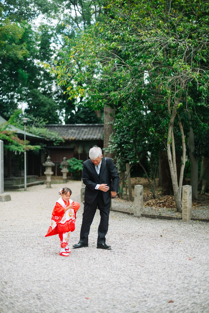 知立神社の鳥居をくぐるとき、両家のじいじとばあばが合流した。3人の大人に囲まれて、いつもとちがう雰囲気に戸惑いつつも、Hちゃんの背中が少し誇らしそうに見えた。