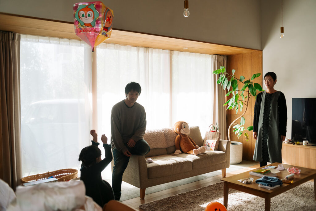 お父さんお母さんと手を繋いでジャンプする姿、着物姿で風車を吹くHちゃん、じーじと紙風船を追いかけるシーン。緑の木々の下を、家族みんなで歩いていく後ろはとっても素敵でした。