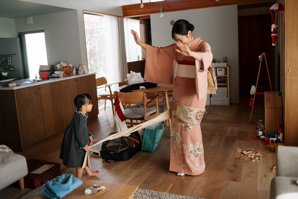 おママごとで遊び、いつものようにパパとぬいぐるみで遊んで、ソファで3人並んで。 着物を着た朝と、なんにも変わらない3歳がいる。
