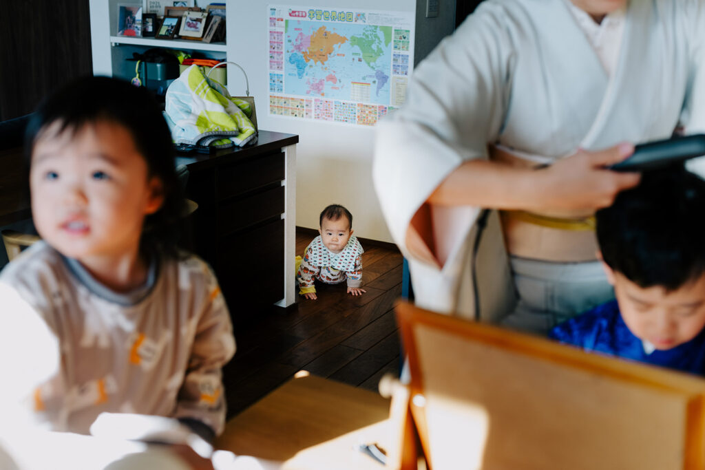 お宮参りのタイミングで、神社での撮影とご自宅での撮影をセットにするのも人気です。外での撮影では赤ちゃんのご機嫌が気になることもありますが、家での撮影なら落ち着いた雰囲気の中で撮影できます。その違いも愛おしいものです。ご家族との自然なふれあいの写真も残せるので、思い出深い1日になるでしょう。